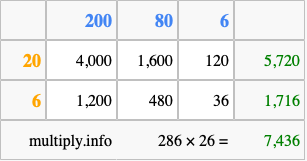 Finally, we add up all the sums we found in step 3 to get our final answer to 286 times 26.