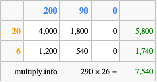 Below is an illustration showing you how to calculate 290 times 26 using the box method, using the instructions above.