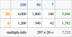 That's all there is to it! As you can see from the box above, the answer to 297 times 26 using the box method is 7,722.
