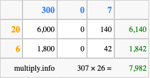 That's all there is to it! As you can see from the box above, the answer to 307 times 26 using the box method is 7,982.