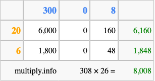 Finally, we add up all the sums we found in step 3 to get our final answer to 308 times 26.