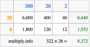 Below is an illustration showing you how to calculate 322 times 26 using the box method, using the instructions above.