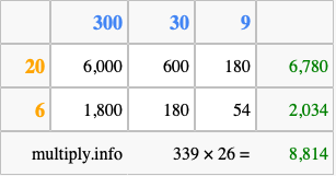 That's all there is to it! As you can see from the box above, the answer to 339 times 26 using the box method is 8,814.
