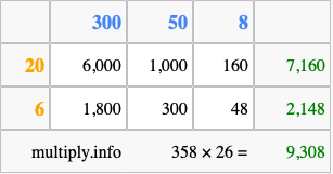 That's all there is to it! As you can see from the box above, the answer to 358 times 26 using the box method is 9,308.
