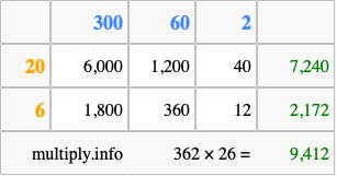 Below is an illustration showing you how to calculate 362 times 26 using the box method, using the instructions above.