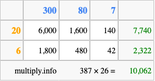 Below is an illustration showing you how to calculate 387 times 26 using the box method, using the instructions above.
