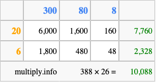 Finally, we add up all the sums we found in step 3 to get our final answer to 388 times 26.