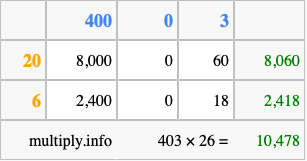 That's all there is to it! As you can see from the box above, the answer to 403 times 26 using the box method is 10,478.