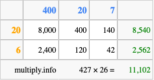 That's all there is to it! As you can see from the box above, the answer to 427 times 26 using the box method is 11,102.