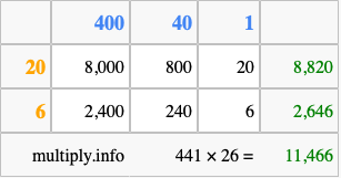 That's all there is to it! As you can see from the box above, the answer to 441 times 26 using the box method is 11,466.