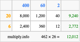 Finally, we add up all the sums we found in step 3 to get our final answer to 462 times 26.
