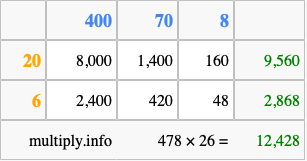 Finally, we add up all the sums we found in step 3 to get our final answer to 478 times 26.