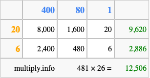Finally, we add up all the sums we found in step 3 to get our final answer to 481 times 26.