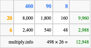 Finally, we add up all the sums we found in step 3 to get our final answer to 498 times 26.