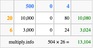 Finally, we add up all the sums we found in step 3 to get our final answer to 504 times 26.