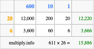 That's all there is to it! As you can see from the box above, the answer to 611 times 26 using the box method is 15,886.