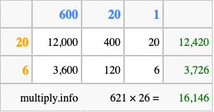 That's all there is to it! As you can see from the box above, the answer to 621 times 26 using the box method is 16,146.