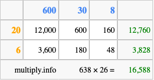 That's all there is to it! As you can see from the box above, the answer to 638 times 26 using the box method is 16,588.