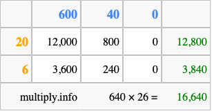 Finally, we add up all the sums we found in step 3 to get our final answer to 640 times 26.