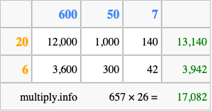That's all there is to it! As you can see from the box above, the answer to 657 times 26 using the box method is 17,082.