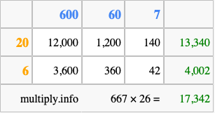 Finally, we add up all the sums we found in step 3 to get our final answer to 667 times 26.