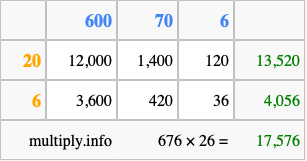 Finally, we add up all the sums we found in step 3 to get our final answer to 676 times 26.