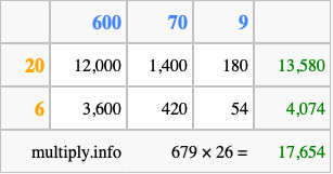 Finally, we add up all the sums we found in step 3 to get our final answer to 679 times 26.