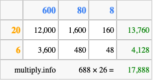 Finally, we add up all the sums we found in step 3 to get our final answer to 688 times 26.