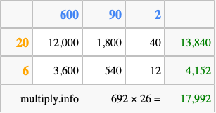 Finally, we add up all the sums we found in step 3 to get our final answer to 692 times 26.