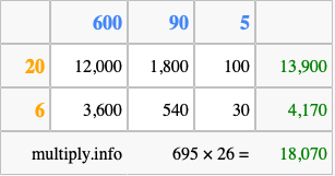 Finally, we add up all the sums we found in step 3 to get our final answer to 695 times 26.