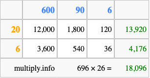 Finally, we add up all the sums we found in step 3 to get our final answer to 696 times 26.