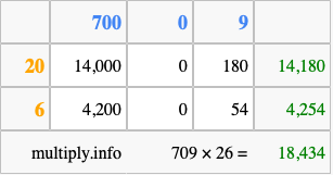 That's all there is to it! As you can see from the box above, the answer to 709 times 26 using the box method is 18,434.