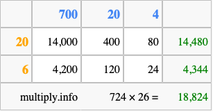 Finally, we add up all the sums we found in step 3 to get our final answer to 724 times 26.