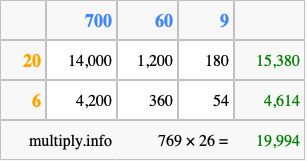 Finally, we add up all the sums we found in step 3 to get our final answer to 769 times 26.