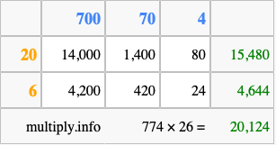 Finally, we add up all the sums we found in step 3 to get our final answer to 774 times 26.