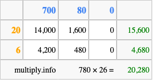 Finally, we add up all the sums we found in step 3 to get our final answer to 780 times 26.