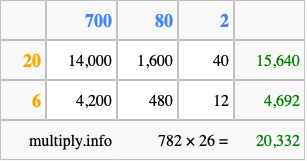 Finally, we add up all the sums we found in step 3 to get our final answer to 782 times 26.