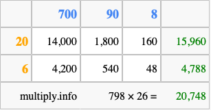 Finally, we add up all the sums we found in step 3 to get our final answer to 798 times 26.
