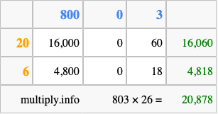 That's all there is to it! As you can see from the box above, the answer to 803 times 26 using the box method is 20,878.