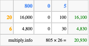 Finally, we add up all the sums we found in step 3 to get our final answer to 805 times 26.