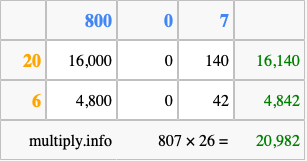 That's all there is to it! As you can see from the box above, the answer to 807 times 26 using the box method is 20,982.