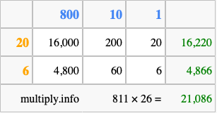 That's all there is to it! As you can see from the box above, the answer to 811 times 26 using the box method is 21,086.