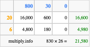 Below is an illustration showing you how to calculate 830 times 26 using the box method, using the instructions above.