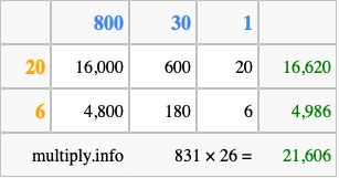 Below is an illustration showing you how to calculate 831 times 26 using the box method, using the instructions above.