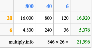 Finally, we add up all the sums we found in step 3 to get our final answer to 846 times 26.