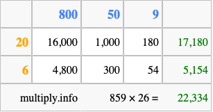 That's all there is to it! As you can see from the box above, the answer to 859 times 26 using the box method is 22,334.