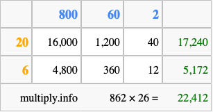 Finally, we add up all the sums we found in step 3 to get our final answer to 862 times 26.