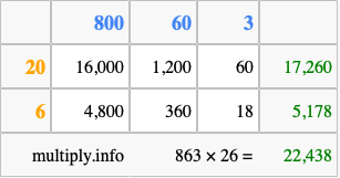Finally, we add up all the sums we found in step 3 to get our final answer to 863 times 26.