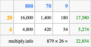 That's all there is to it! As you can see from the box above, the answer to 879 times 26 using the box method is 22,854.