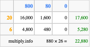 Finally, we add up all the sums we found in step 3 to get our final answer to 880 times 26.